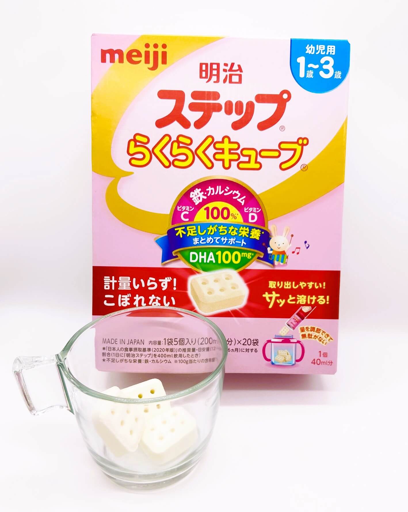 キューブ形状で計量いらず、とけやすく持ち運びにも便利。ミルクや料理に“ちょい足し”すると、幼児期に必要な栄養補給が手軽にできます。