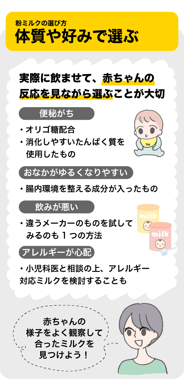 便秘がちな赤ちゃんには、オリゴ糖が配合されたものや、消化しやすいたんぱく質を使用した粉ミルクがおすすめ。逆におなかがゆるくなりやすい子には、腸内環境を整える成分が入ったものを選んでみましょう。