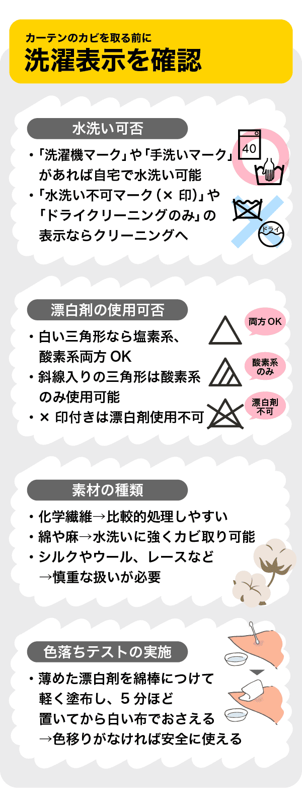 カーテンのカビ取りをはじめる前に、必ず洗濯表示を確認しましょう。カーテンの素材や加工方法によって、使用できる洗剤や処理方法が異なるためです。間違った方法で処理すると、生地が傷んだり色落ちしたりする可能性があります。
