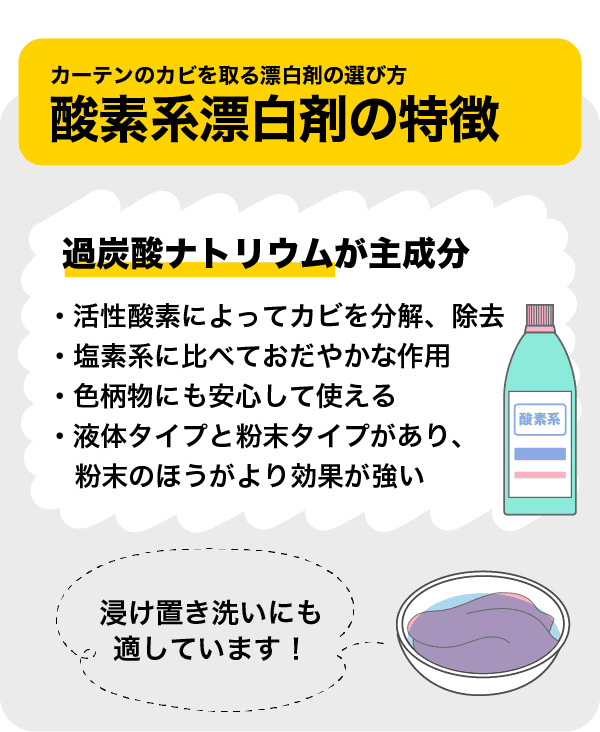 色柄物にも対応できる酸素系漂白剤は、多くのカーテンに使用できます。中程度のカビなら問題なく取り除くことができ、臭いもおだやかで扱いやすいのが特徴です。 -