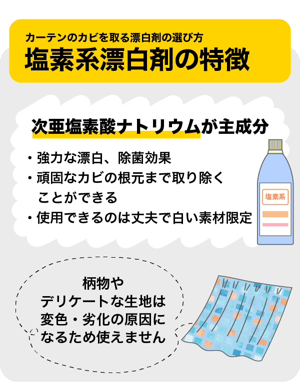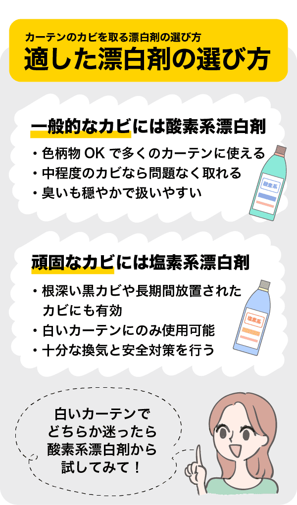 カーテンの素材やカビの程度を考慮し、使用する漂白剤を選びましょう。漂白剤を決める際のポイントを紹介します。