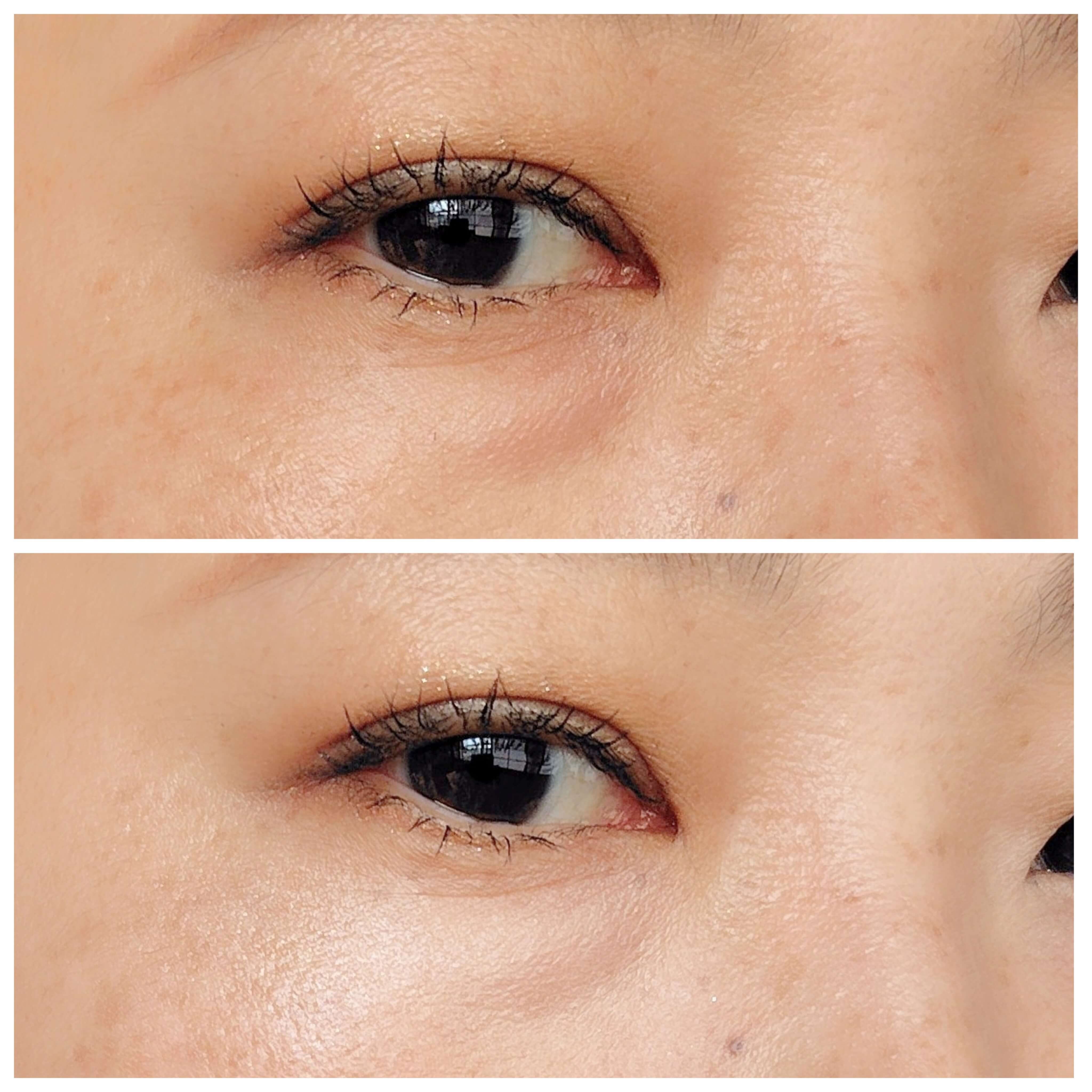 筆者の目元は目の下のたるみによる黒クマの要素も含んでいるので、色だけではカバーしきれない部分をハイライターのツヤでやわらいだ印象にメイクアップ。厚塗りしなくても明るい目元印象を目指せるのがうれしいポイントです。