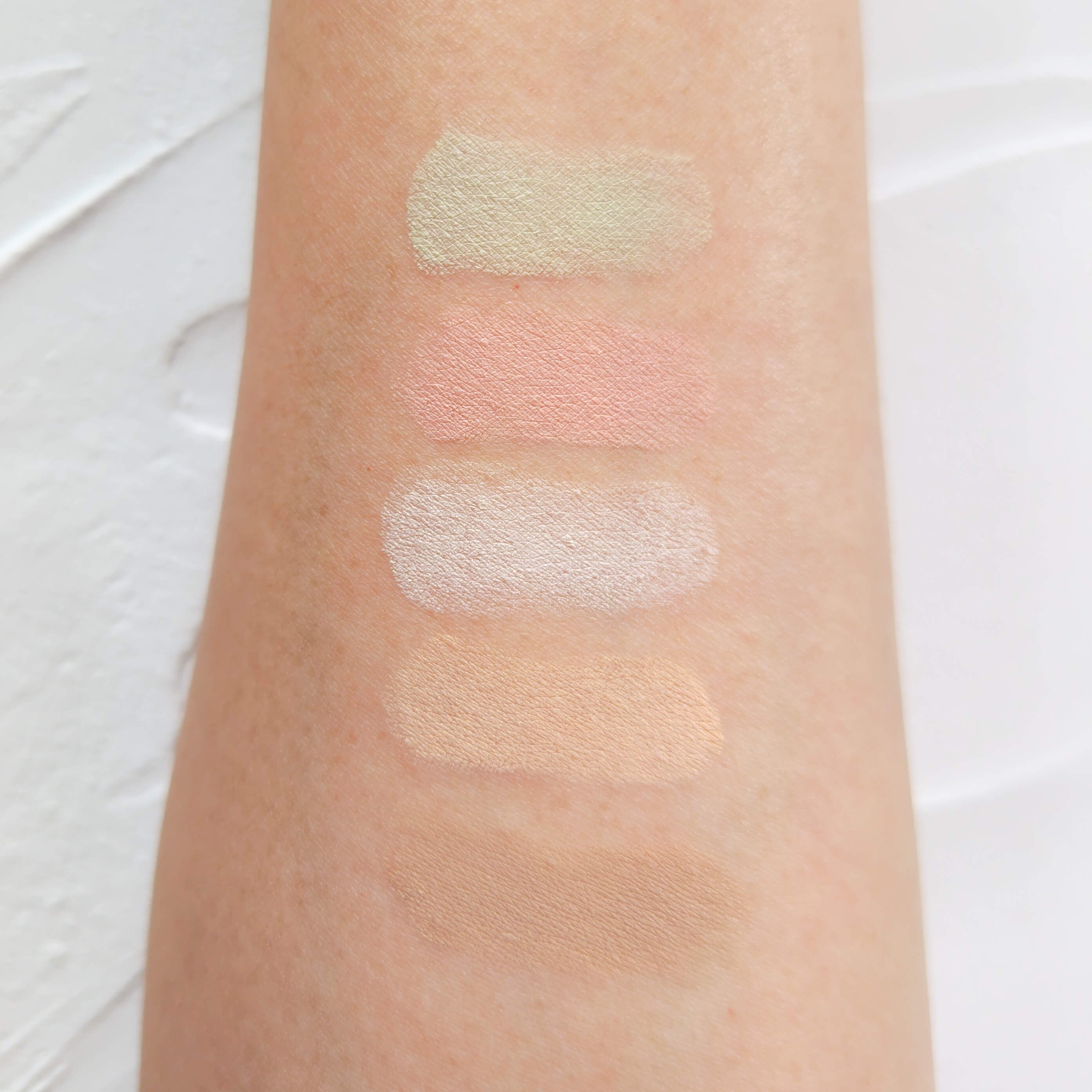 うるおいバームは無色、ハイライターはパール感ある質感です。真ん中のコンシーラーもしっとりとした質感で、おでかけ中の色ムラはもちろん、乾燥くずれのお直しにもぴったりなテクスチャーが特徴的です。