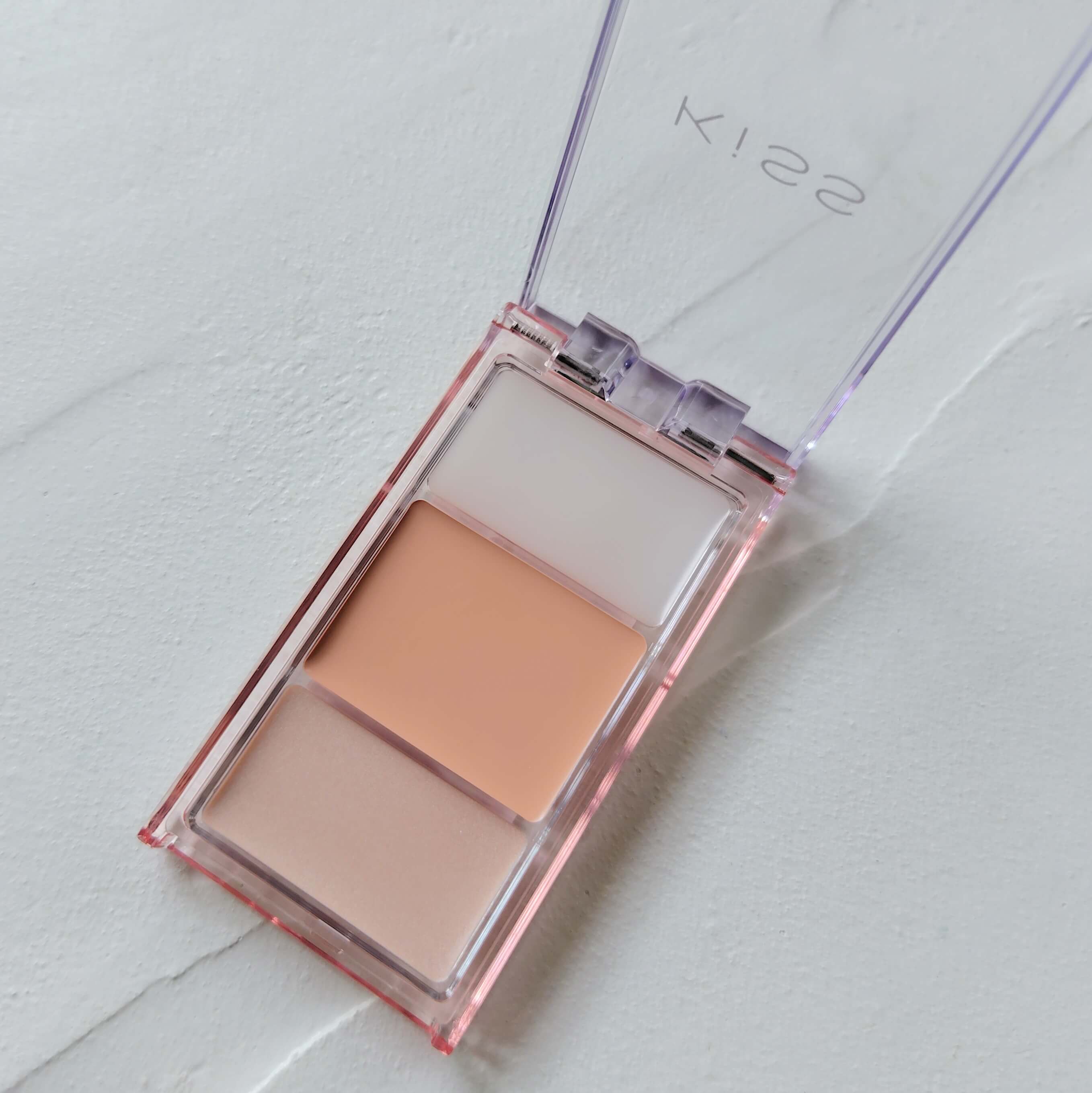 上からうるおいバーム、コンシーラー、ハイライターが並ぶ3色パレットです。