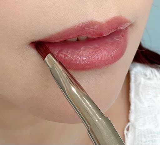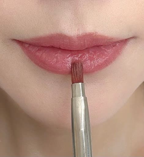 ブラシでリップの山と下唇の底からリップをのせていきます。口角から山、口角から底までつなげるようにのせて、中を塗りつぶします。
