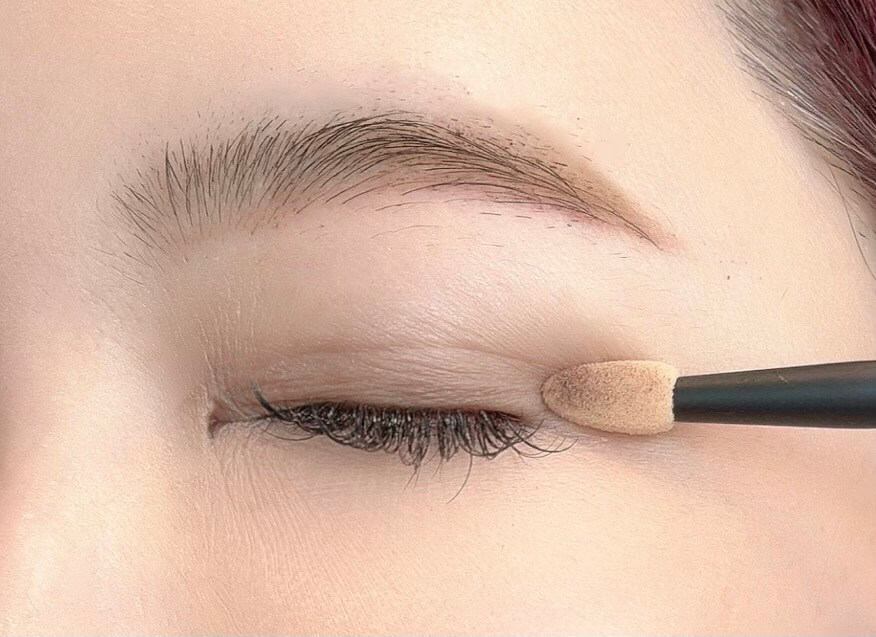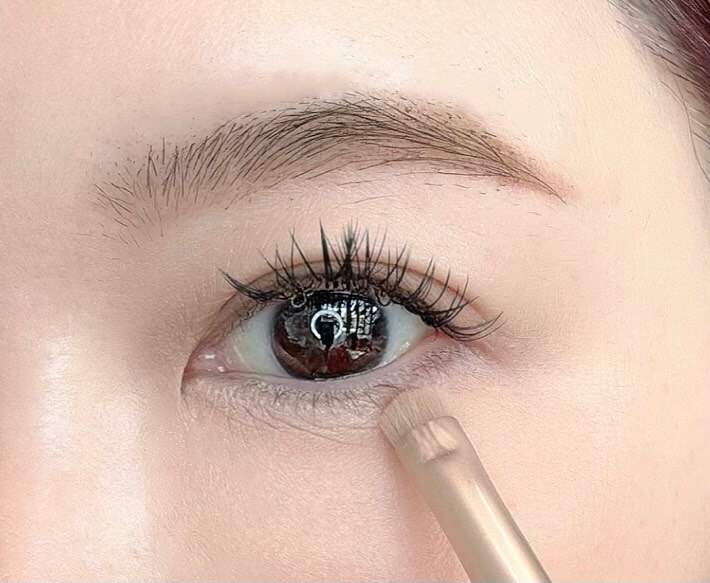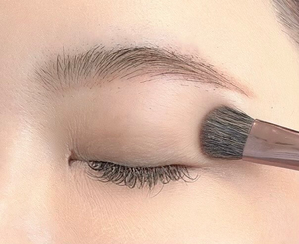 ベージュをまぶた全体に、ブラウンを二重幅に。濃いブラウンを目尻から黒目外側に細く入れ、奥行きを演出。