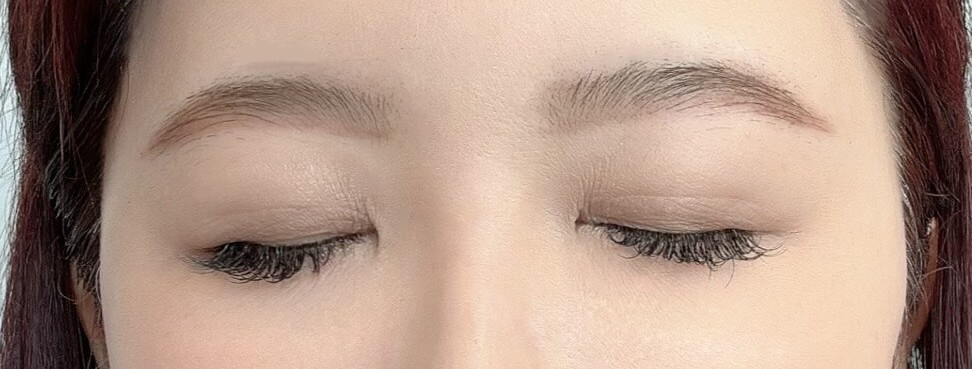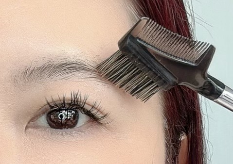 やや平行気味に仕上げ、パウダーと眉マスカラを組み合わせて毛流れを生かすと、柔らかく若々しい印象に。