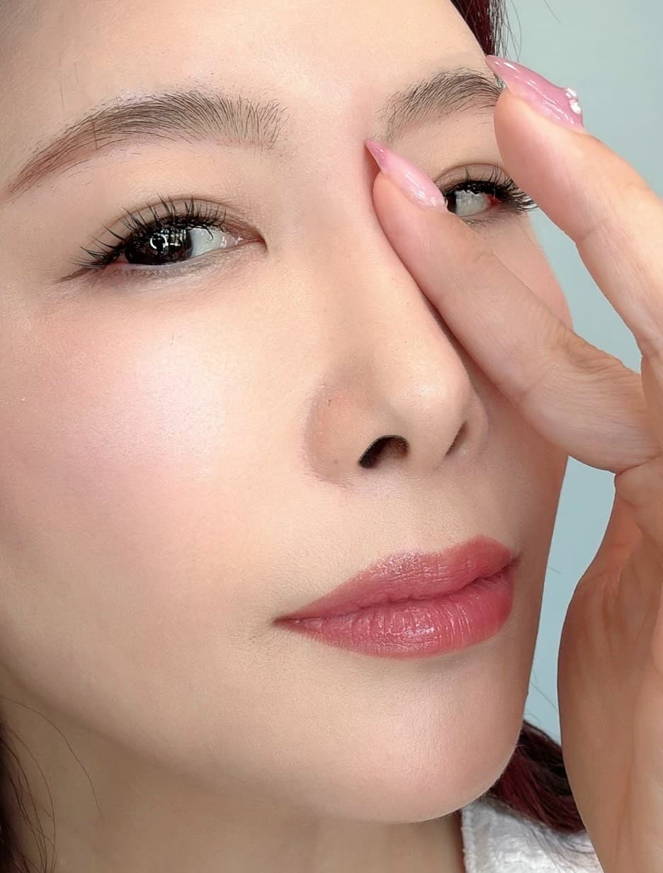 Cゾーンハイライトは目尻横から頬骨にかけてC字を描き、指でトントン。ハイライト効果で目元全体がリフトアップして見えます。光で立体感をプラス。入れすぎると逆効果なので控えめに。