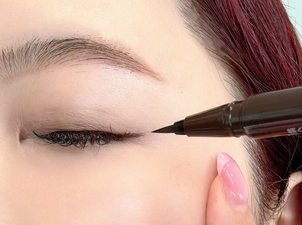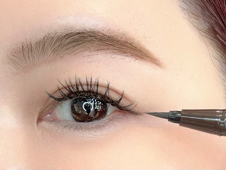 太さは極細で、まつ毛の隙間を埋めるように描くのが基本。目尻は2〜3mmほどスッと延長すると、切れ長に見えて若々しい印象に。下まぶたに太く入れると逆に老けて見えるので、目尻1/3程度にごく細く入れる程度で十分です。