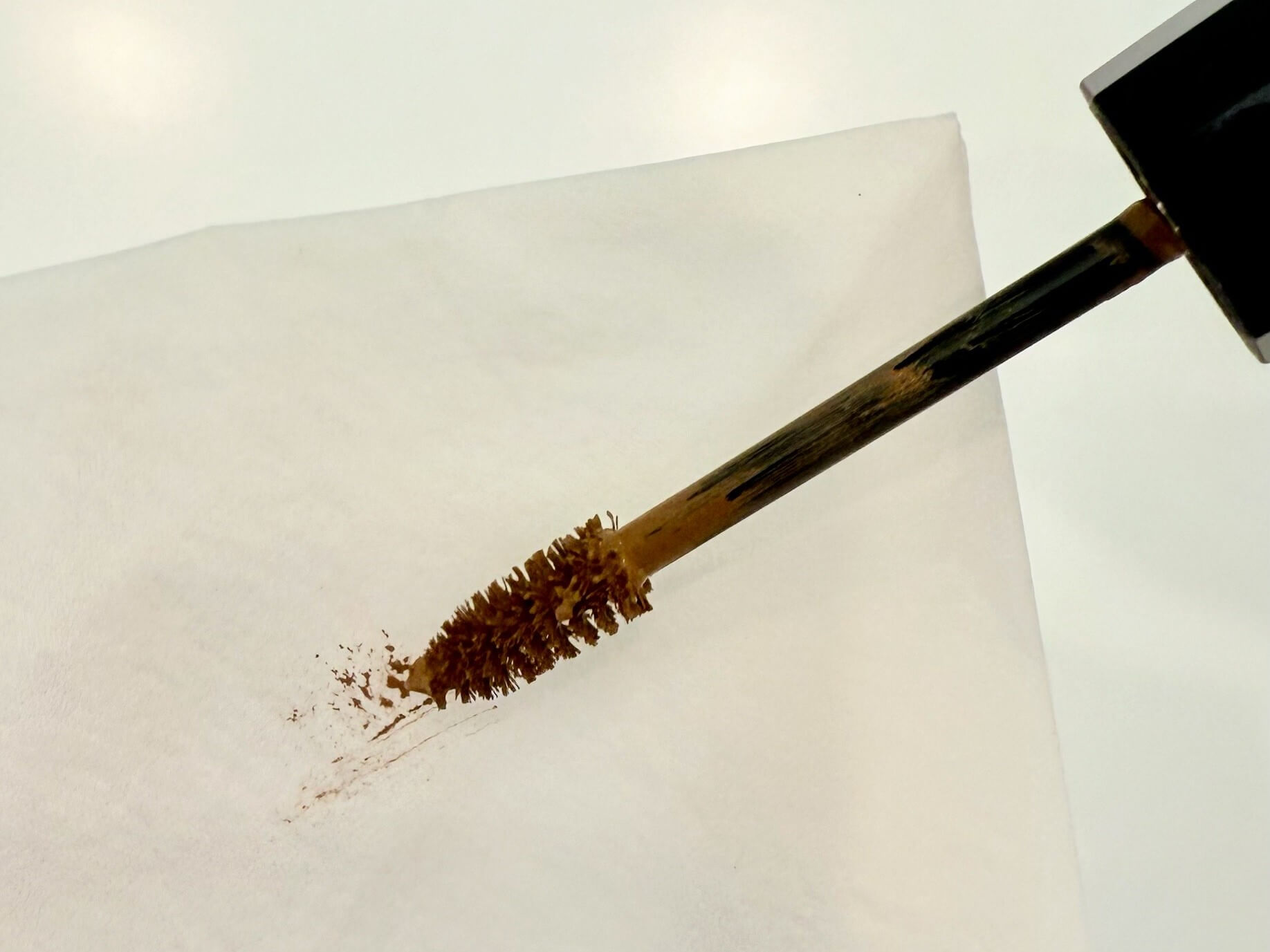 眉マスカラの容器からブラシを抜き、ティッシュで余分な液を拭きます。