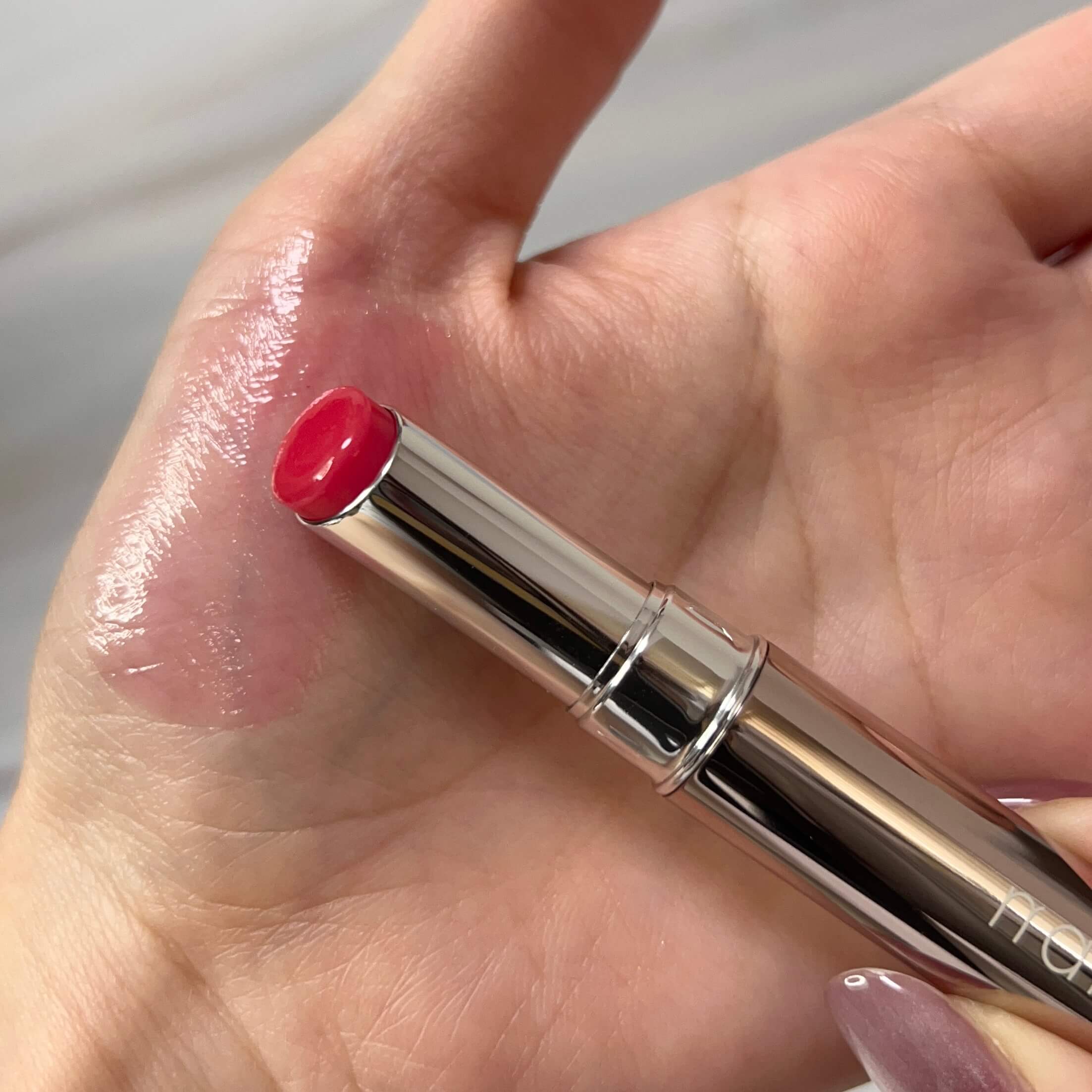 ぴたっと密着感のあるつけ心地で、うるおいと色味が長続きします。ほどよい透け感でクリアに発色するため失敗しにくく、リップクリーム感覚で鏡なしで塗って多少はみ出てもナチュラルです。