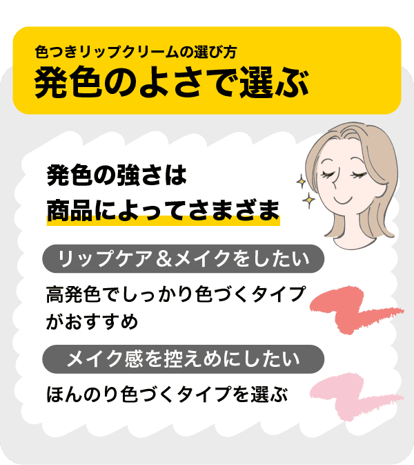 1本でリップケアとメイクを済ませたい場合、高発色でしっかり色づくタイプがおすすめです。それに対して、すっぴん風の唇やメイク感の控えめな仕上がりがお好みであれば、ほんのり色づくタイプを選ぶとよいでしょう。