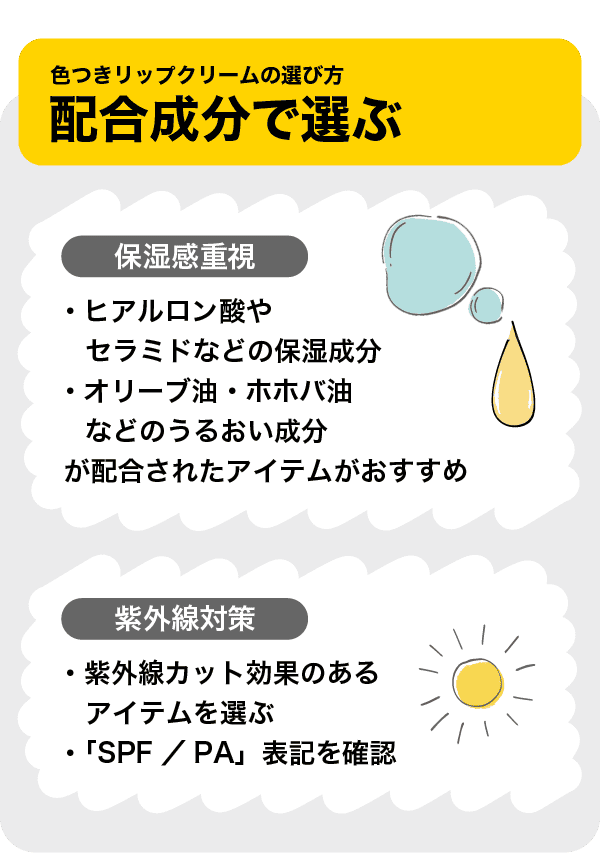 色つきリップクリームを選ぶ際に注目したい点をいくつかまとめました。用途や重視するポイントをチェックして、自分に合ったアイテムを選んでくださいね。