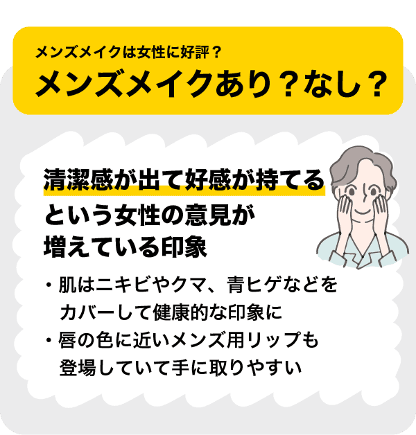 メンズメイクをすると眉や肌、リップなどに清潔感が出て好感が持てるという女性の意見が増えている印象です。とくに肌は、ニキビやクマ、青ヒゲなどをカバーすることで健康的な印象を与えます。リップも最近では「粘膜色」という健康的な唇の色に近い色がメンズ用のコスメで販売されていて、手に取りやすい商品が多くなっています。