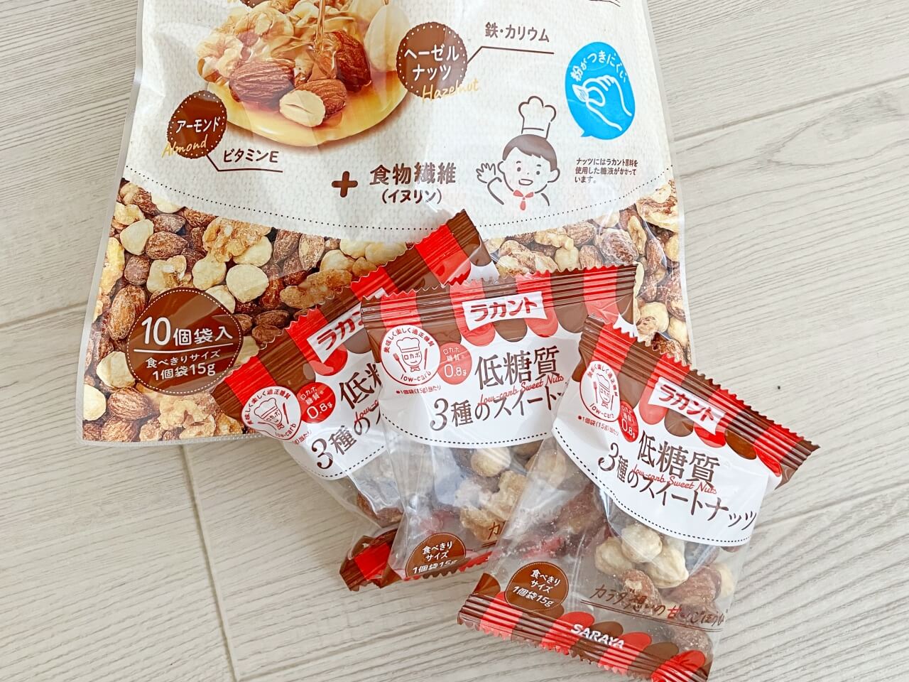 ラカントのナッツシリーズは小分けタイプで量を管理しやすく、持ち運びにも便利。しっかりとした食感で食べ応えがあり、口寂しいときや仕事の合間のおやつに向いています。少量でも満足感が続く低糖質スイーツです。