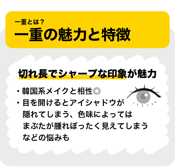 切れ長でシャープな印象が魅力の一重まぶたは、流行りの韓国系メイクと相性もよいです。クールな魅力がある半面、目を開けるとアイシャドウの色味が隠れてしまったり、使うアイシャドウの色味によってはまぶたが腫れぼったく見えたりします。