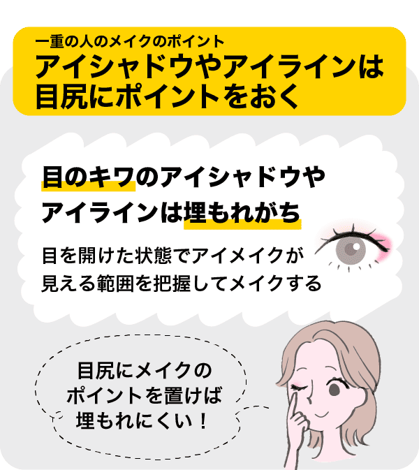一重の人は、目を開いた状態では目のキワに入れたアイシャドウやアイラインが埋もれて見えなくなることが多いです。そのため、アイシャドウやアイラインは目尻にポイントをおくのがおすすめです。目を開けた状態でアイメイクが見える範囲を把握してメイクをしましょう。