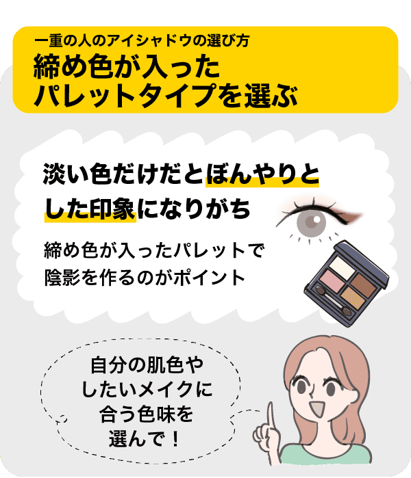 一重のアイメイクは、淡い色だけで仕上げるとぼんやりとした印象になってしまいがちです。陰影を作るのがポイントになるので、締め色が入ったパレットタイプを選ぶのがおすすめ。自分の肌色に合うものや、したいメイクに合う色味のものを選びましょう。
