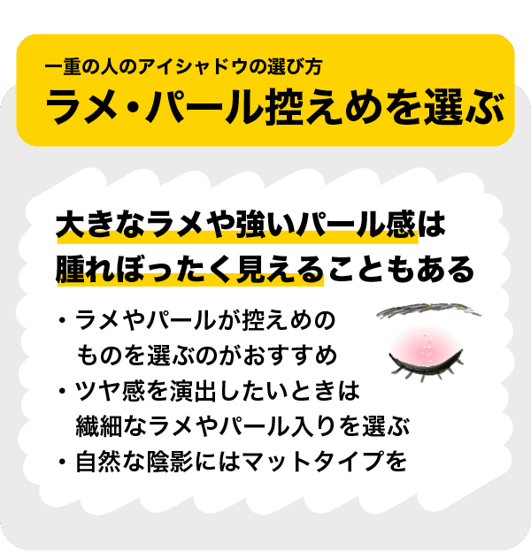 一重の人がグリッターのような大きなラメが入ったものや、パール感が強すぎるアイシャドウを使うとまぶたが腫れぼったく見えてしまうことがあります。そのため、ラメやパールが控えめのものを選ぶのがおすすめです。
