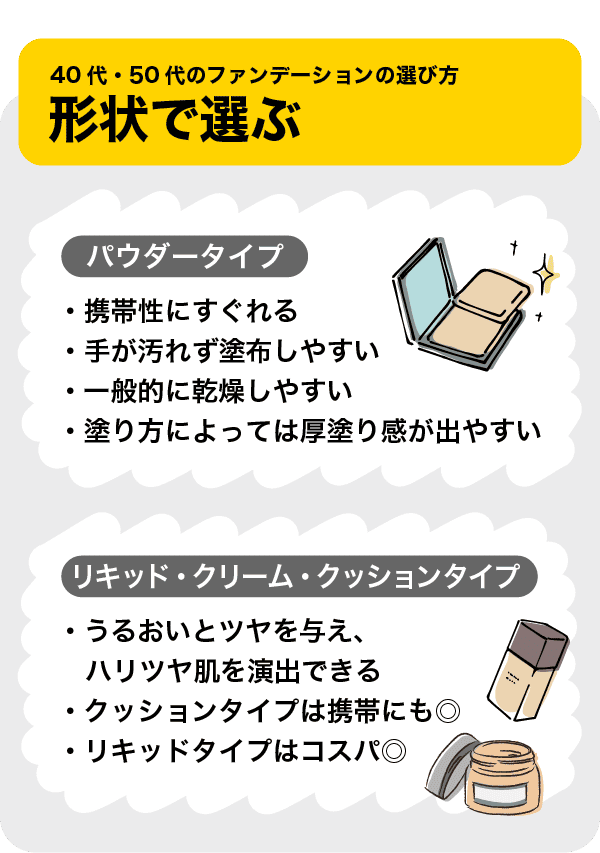 ファンデーションの形状で選ぶのも40代に合うファンデーションを見つけるポイントです。