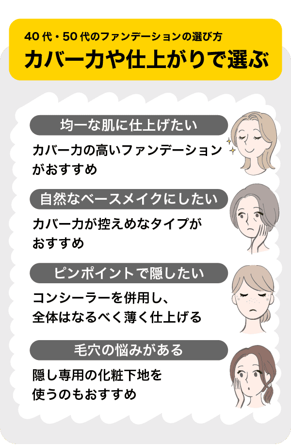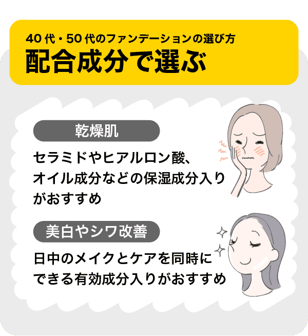 ここでは、40代・50代の大人世代がファンデーションを選ぶ際に着目すべき点を解説します。