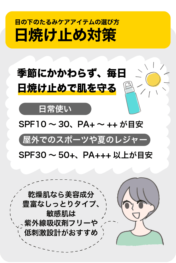 目の下のたるみを防ぐためには、肌を乾燥や紫外線ダメージから守り、早めにケアをはじめることが大切です。ここでは「スキンケア」「紫外線対策」「内側からケア」の3つの視点から、ケアアイテムの選び方のコツを紹介します。