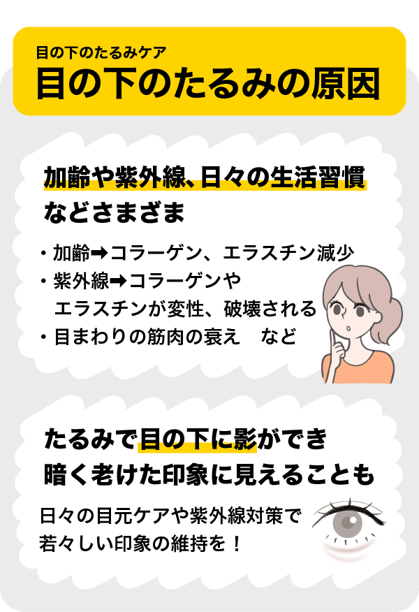 目の下のたるみの原因は、加齢や紫外線、日々の生活習慣などさまざまな要因が関係しています。肌の奥にあるコラーゲンやエラスチンは、肌のハリや弾力を支える役割を担っていますが、年齢を重ねるにつれて減少していきます。