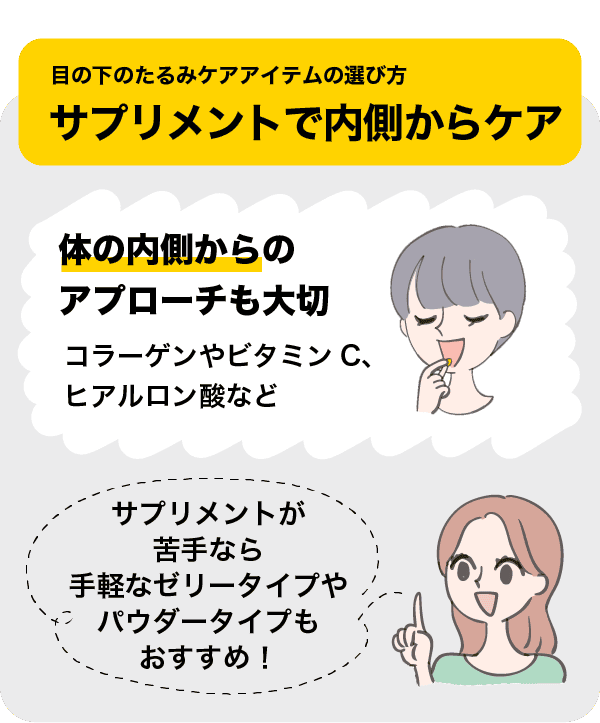 目の下のたるみ対策には、スキンケアによる外側のケアだけでなく、体の内側からのアプローチも大切です。肌のハリや弾力の維持に大切な栄養素「コラーゲン」や、「ビタミンC」、「ヒアルロン酸」などの成分を含むサプリメントを取り入れてみましょう。
