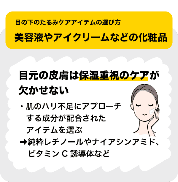 目の下のたるみのための保湿ケアには、純粋レチノールやナイアシンアミド、ビタミンC誘導体など、肌のハリ不足にアプローチする成分が配合されたアイテムを選ぶのもポイントです。