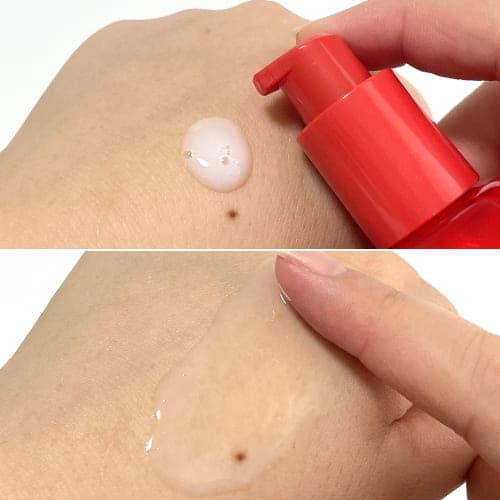 ほんのり白みがかった軽やかなテクスチャーで、洗顔直後の肌にもさらっとなじみます。次に使う化粧水とのなじみも良く、乳液やクリームを重ねても重くならないので、ベタつきにくく使いやすいです。