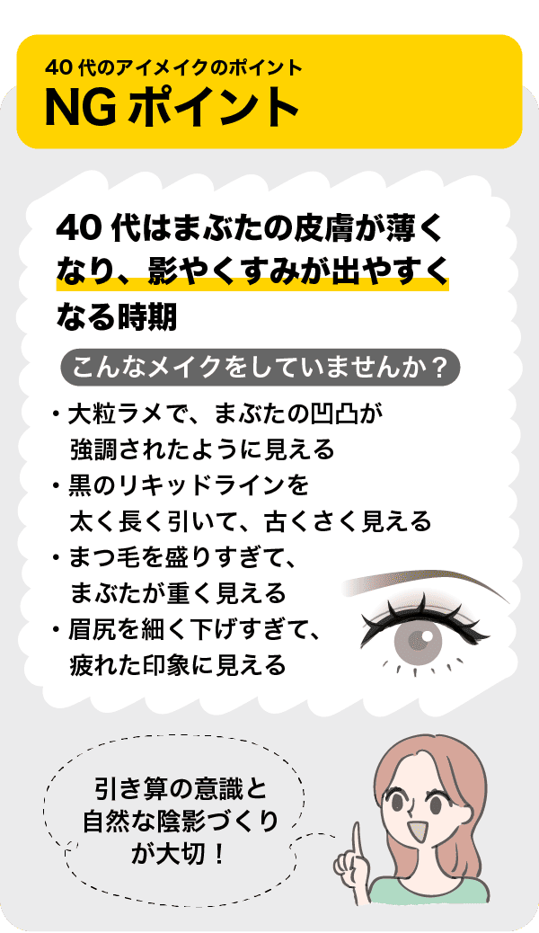 40代は、まぶたの皮膚が薄くなり、影やくすみが出やすくなる時期です。若い頃と同じアイメイクを続けると、逆に小ジワやたるみが強調されたように見えてしまうことがあります。