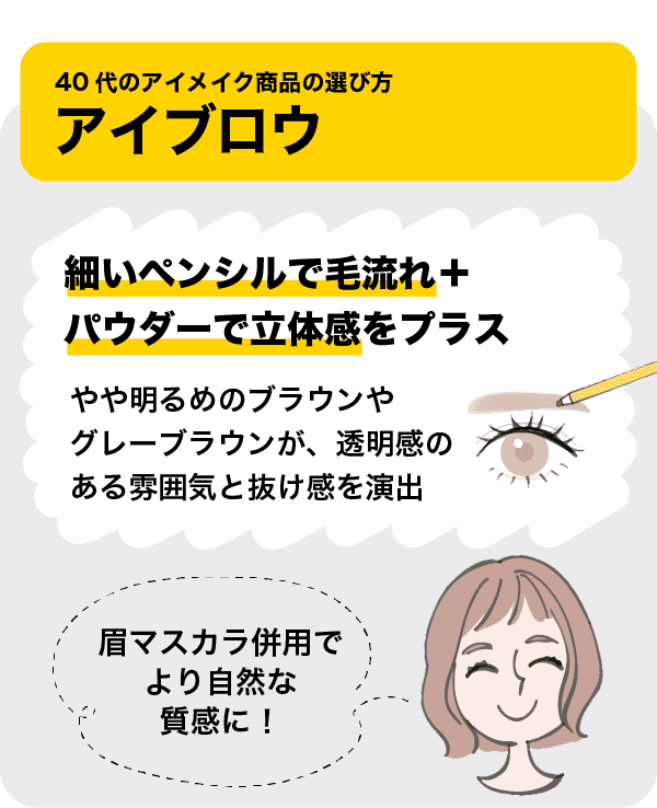 アイブロウペンシルで描いたあとに重ねると、立体感のある印象に仕上がり、40代の大人メイクにもぴったりな軽やかさが生まれます。