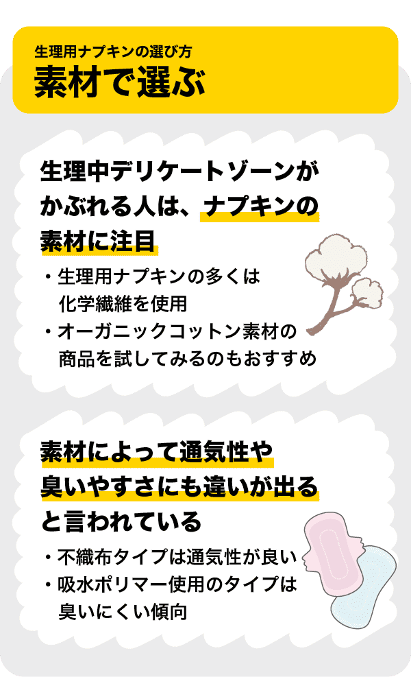 生理期間中にデリケートゾーンがかぶれる人は、ナプキンの素材に注目してみるとよいでしょう。生理用ナプキンの多くは化学繊維を使用しています。一方で、素材にこだわってオーガニックコットンを使用している生理用ナプキンもあるため、試してみるのもおすすめです。
