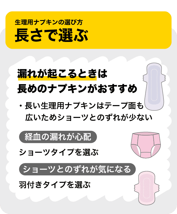 ほかにも、経血の漏れが心配なときにはショーツタイプを選んだり、ショーツとのずれが気になるときには羽付きタイプを選んだりすると、快適に過ごせます。