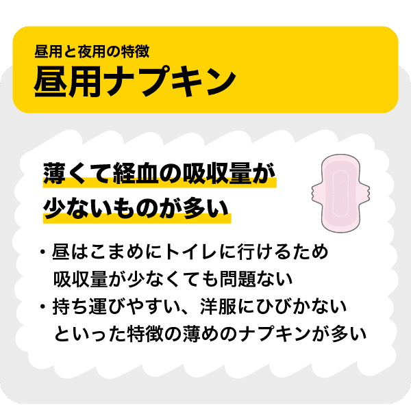 生理用ナプキンにはさまざまな種類がありますが、大きく「昼用」と「夜用」に分けることができます。昼用と夜用では、活動量や活動時の姿勢、トイレに行く頻度に合わせて、ナプキンの厚さや経血の吸収量が異なります。