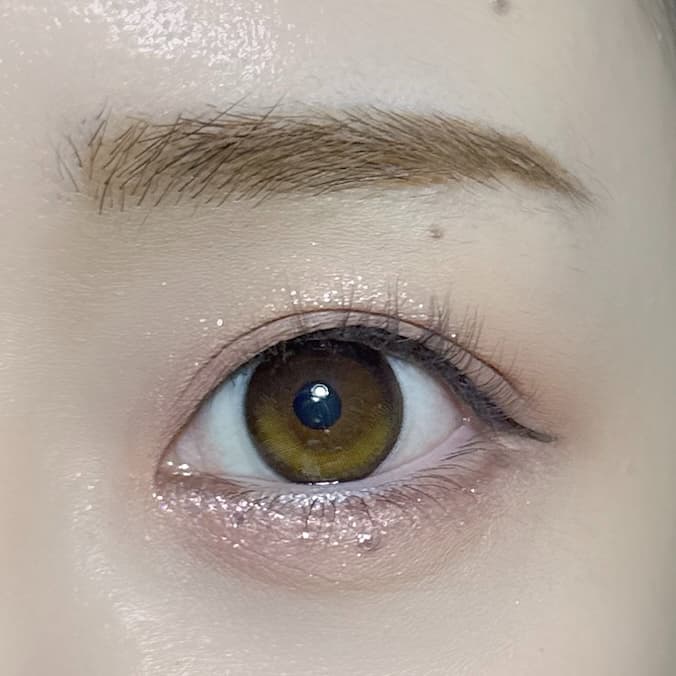 下まぶたのラメシャドウを入れた位置と同じ箇所に、細めにグリッターを重ねます。アイシャドウは淡めで仕上げているため、グリッターの光沢感を使ってさらに立体的に見えるようにします。