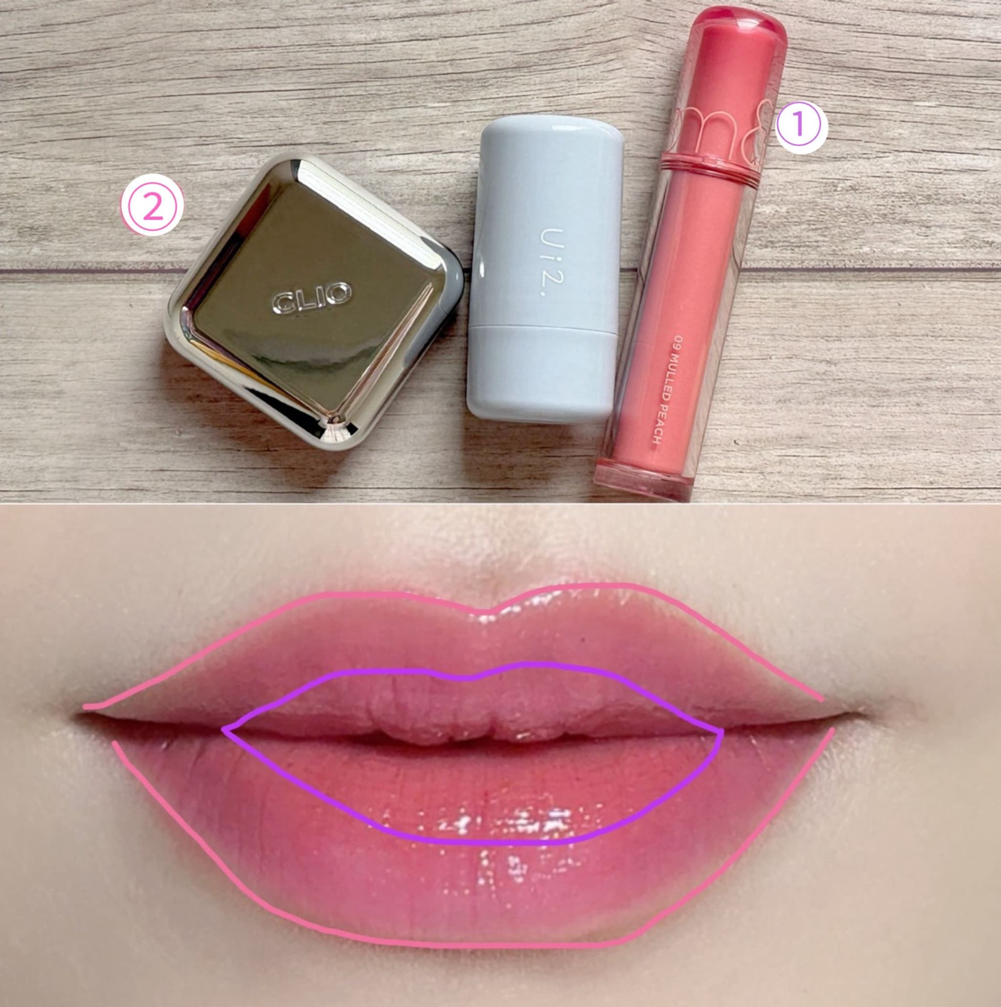 まず、中心に色の残りが強くなるように、内側から濃いカラーのティントを塗ります。次に、リップ①やクリームチーク②を使ってティントをぼかすように外側へ広げていきます。