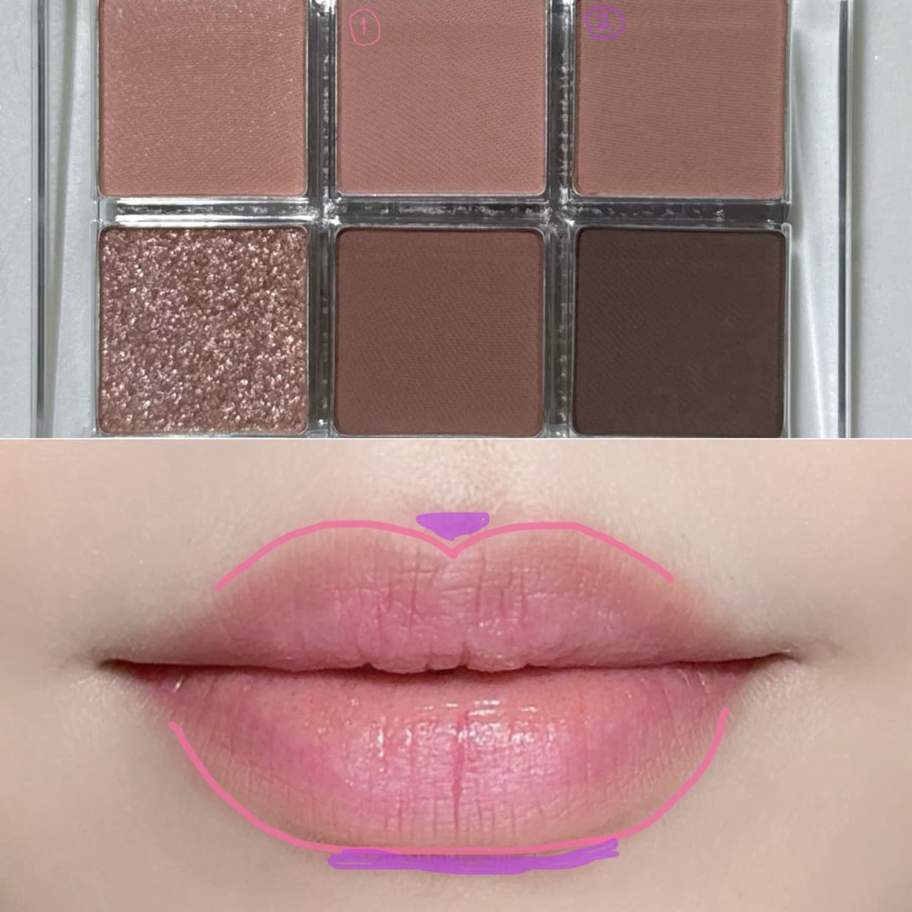 今回はアイシャドウをリップペンシルの代わりに使用しました。唇と同系色の明るい色で唇よりオーバー気味にラインを入れ、暗めのカラーで影を入れます。暗めのカラーは、このアイシャドウパレットでいう上段から選ぶとよいでしょう。