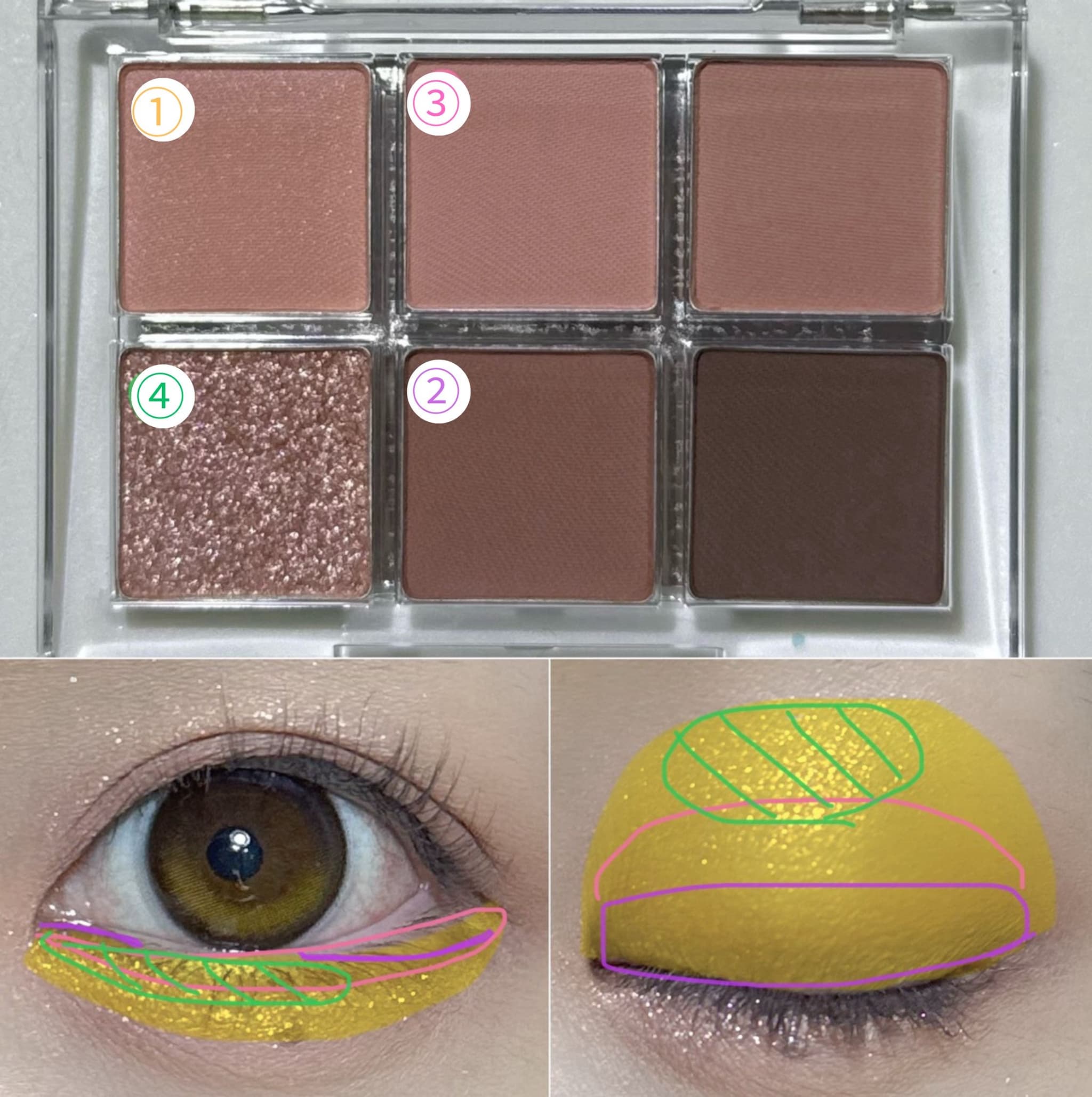 1)上下まぶた全体にベースカラーを入れる(①黄色部分)