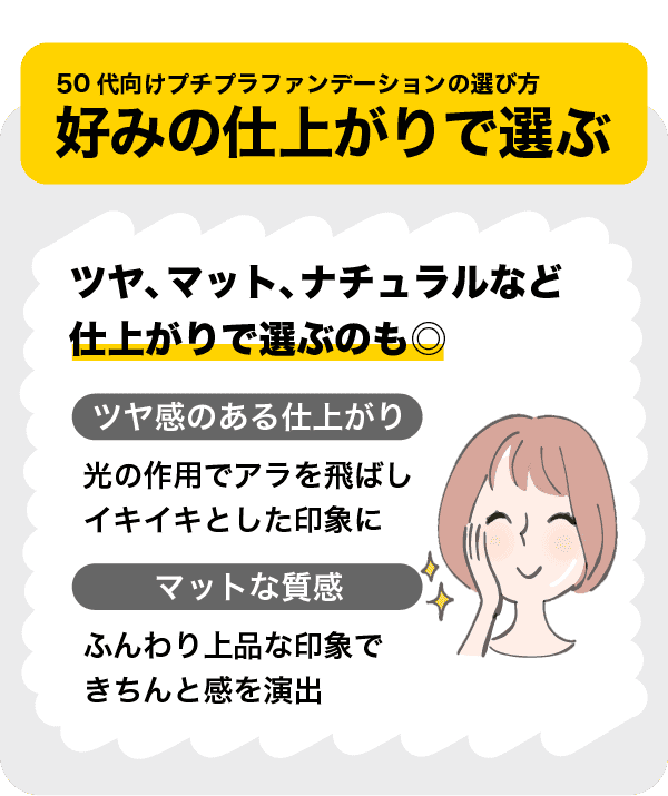 カバー力の有無に加え、ツヤ肌やマット肌、素肌を生かしたナチュラルさなど、好みの仕上がりで選ぶ方法も1つです。