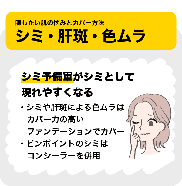こういった色ムラは、カバー力の高いファンデーションでカバーするほか、ピンポイントのシミにはコンシーラーを併用することがおすすめです。
