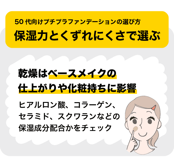 50代の肌に乾燥は大敵です。ベースメイクの仕上がりや化粧持ちに影響するため、乾燥を感じる人は保湿成分の配合されたアイテムを選びましょう。