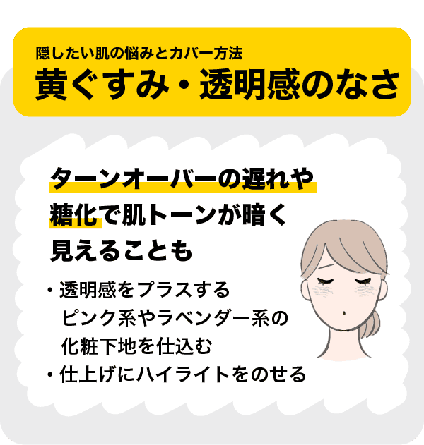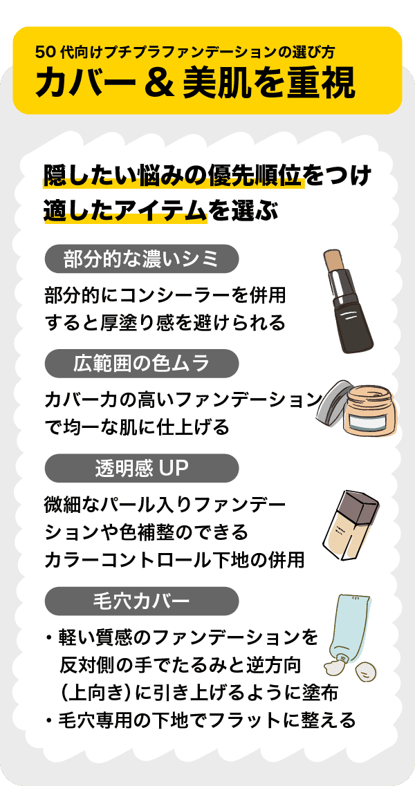 濃いシミ、モヤモヤとした肝斑、黄ぐすみ、毛穴など、まずは隠したい悩みの優先順位をつけ、それに適したアイテムを選びましょう。