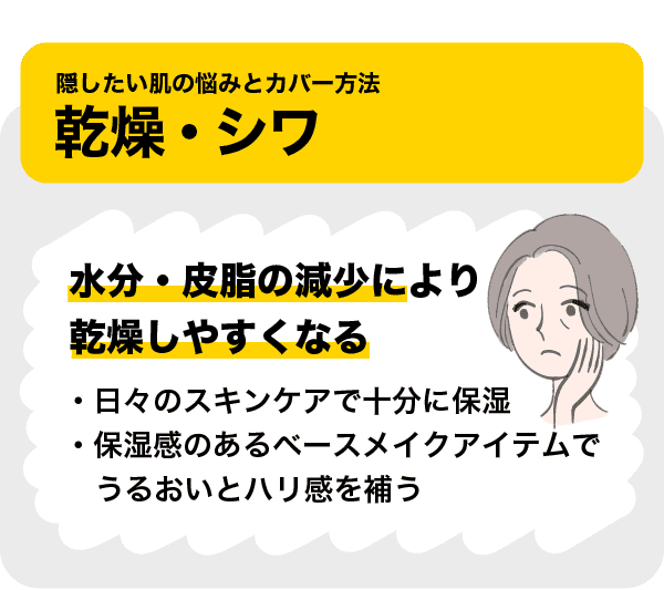 年齢を重ねると肌の水分保持力が低下するとともに、皮脂分泌量も減少し乾燥しやすくなります。カサつきやハリのなさ、乾燥くずれの原因となるため、日々のスキンケアで十分に保湿を行ってください。
