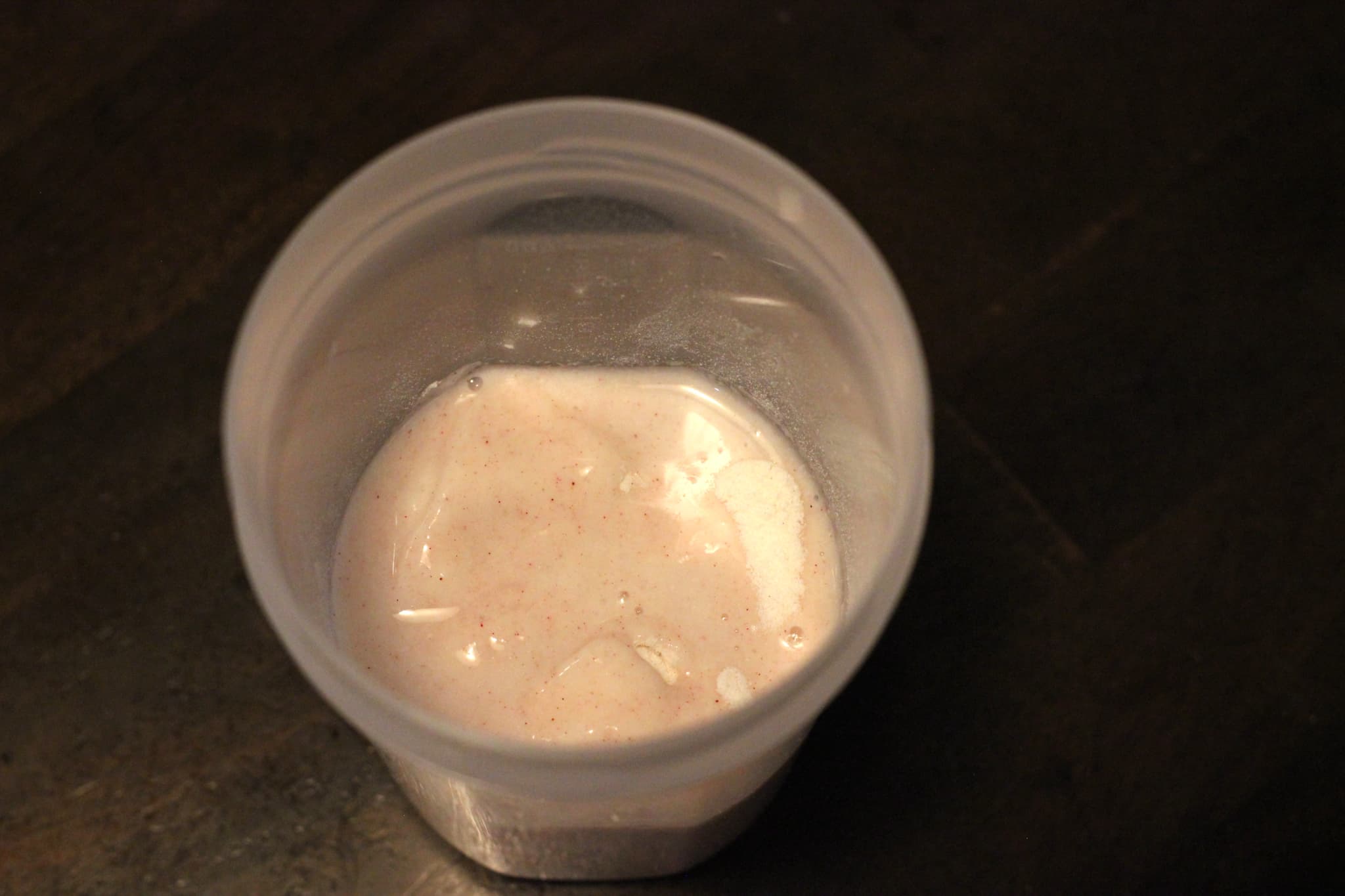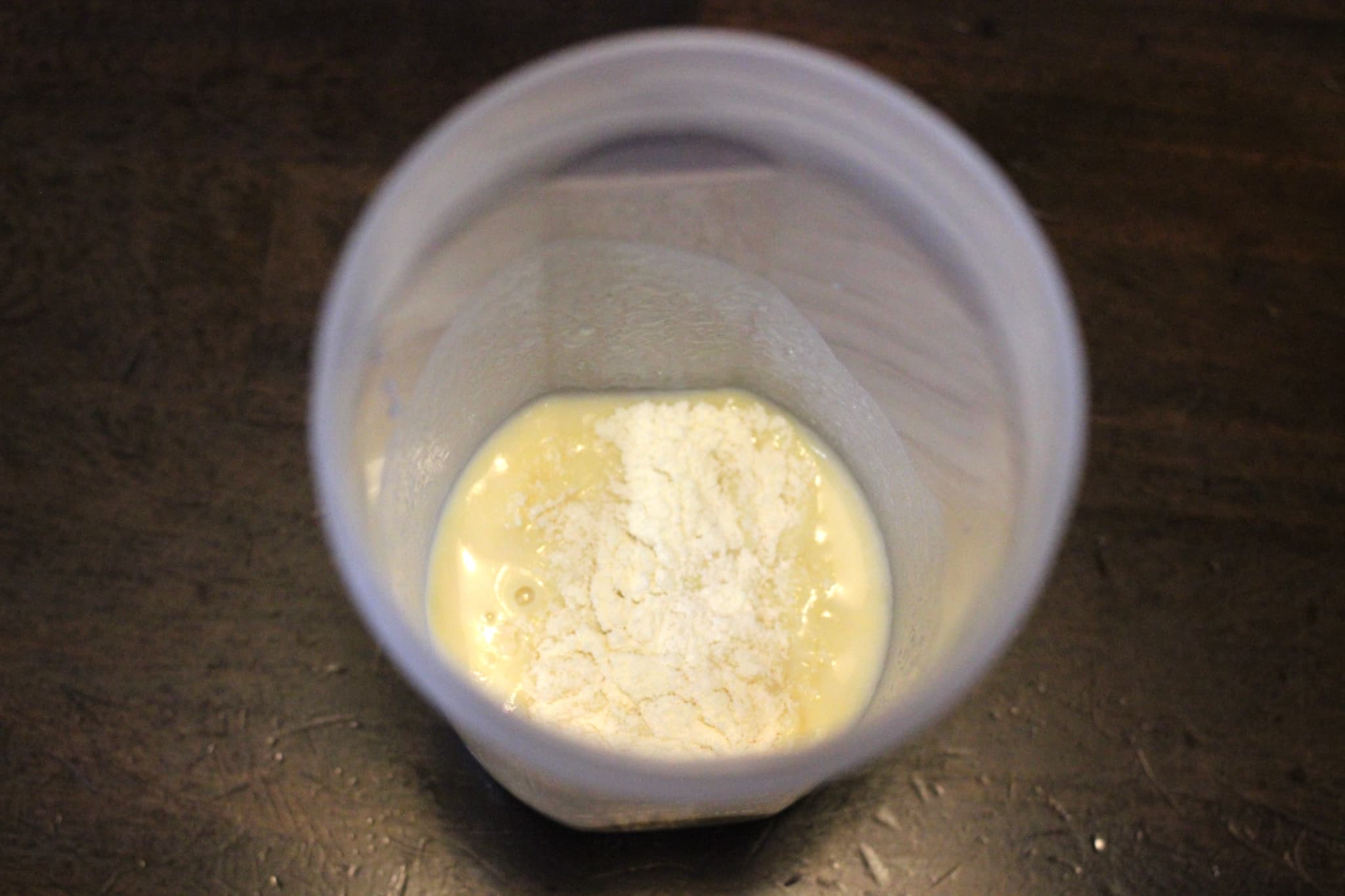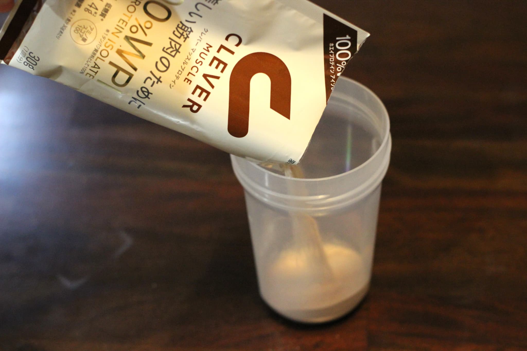 ダマになりやすいため、水を先に入れた後、プロテインを少しずつ加えると混ぜやすくなります。シェイカーで混ぜると泡が立ちやすいです。