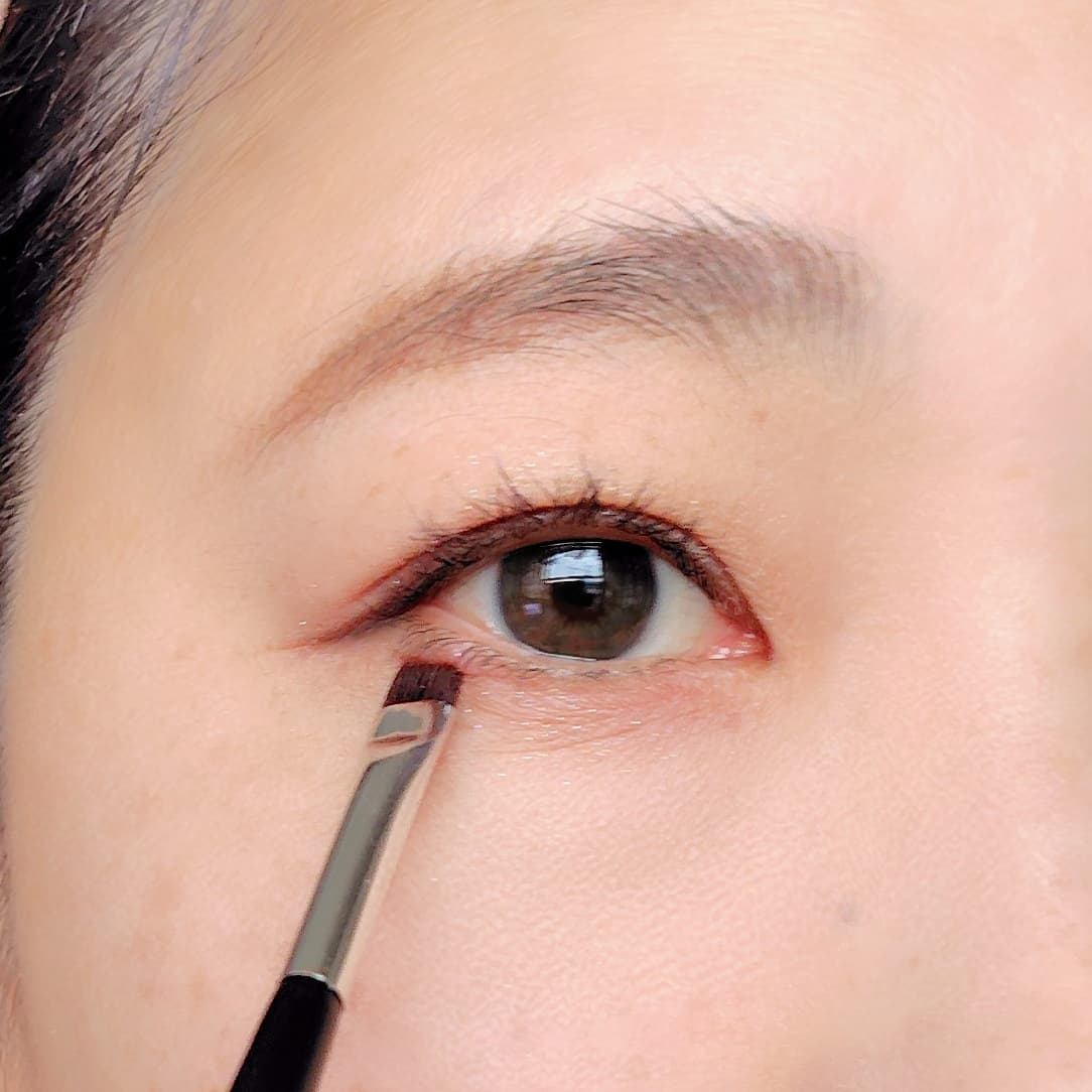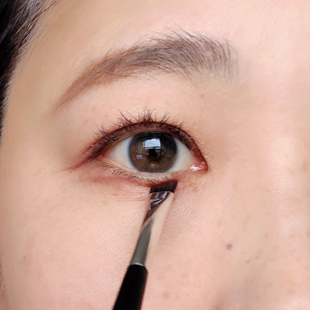 上のアイラインと同じ濃い色のアイシャドウを再びブラシにとり、黒目の下と目尻側にちょんちょんと点を置くように色をのせます。