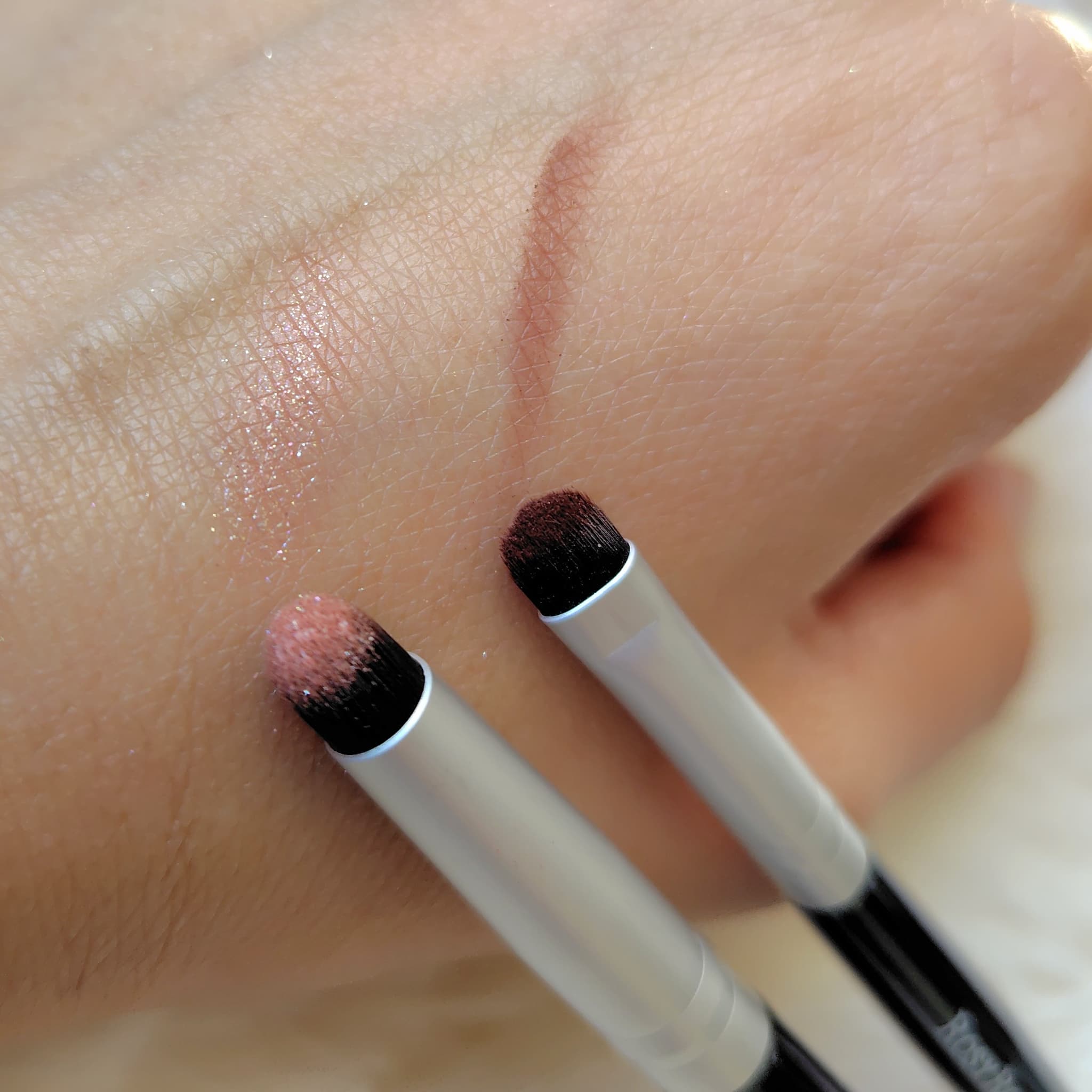 写真左の凸型ブラシは、指先のような使い心地の丸みを帯びたブラシです。涙袋に明るい色をのせたり、ラメ系アイシャドウをポイントでのせるのにおすすめです。