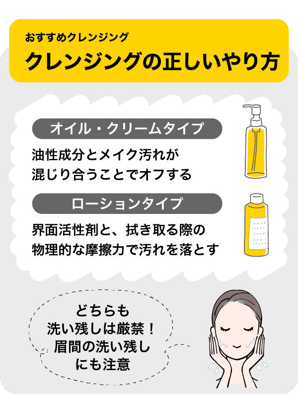 クレンジングはオイルタイプ・クリームタイプのように、おもにメイク汚れを油性成分になじませて落とすタイプと、拭き取りローションタイプのように、界面活性剤と摩擦力で落とすタイプにわかれます。