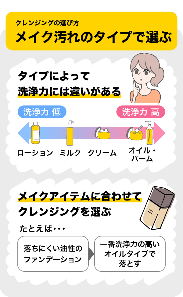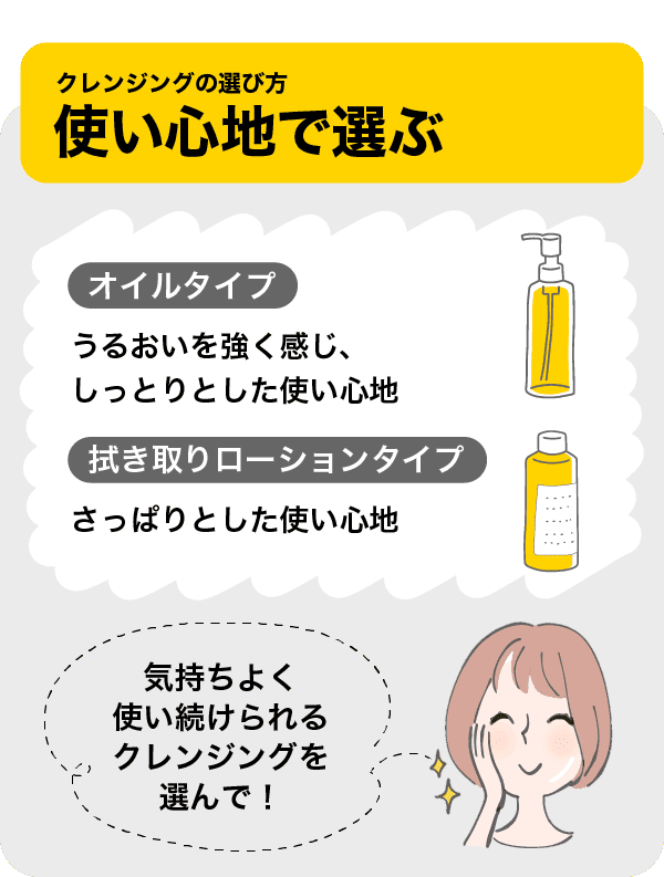 たとえば「落ちにくい油性のファンデーションを使ったから、一番洗浄力の高いオイルタイプで落とす」など、使ったメイクアイテムに合わせてクレンジングを選んでみてください。