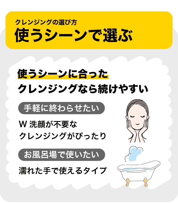 「クレンジングはめんどくさいから手軽に終わらせたい!」という人には、W洗顔が不要なクレンジングがぴったりです。また濡れた手で使えるタイプなら、お風呂場での使用もOKです。使うシーンに合ったクレンジングを選べば毎日続けやすいですね。